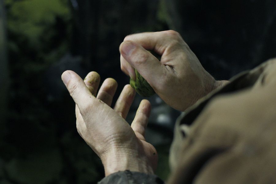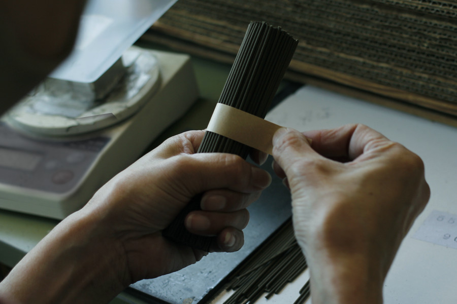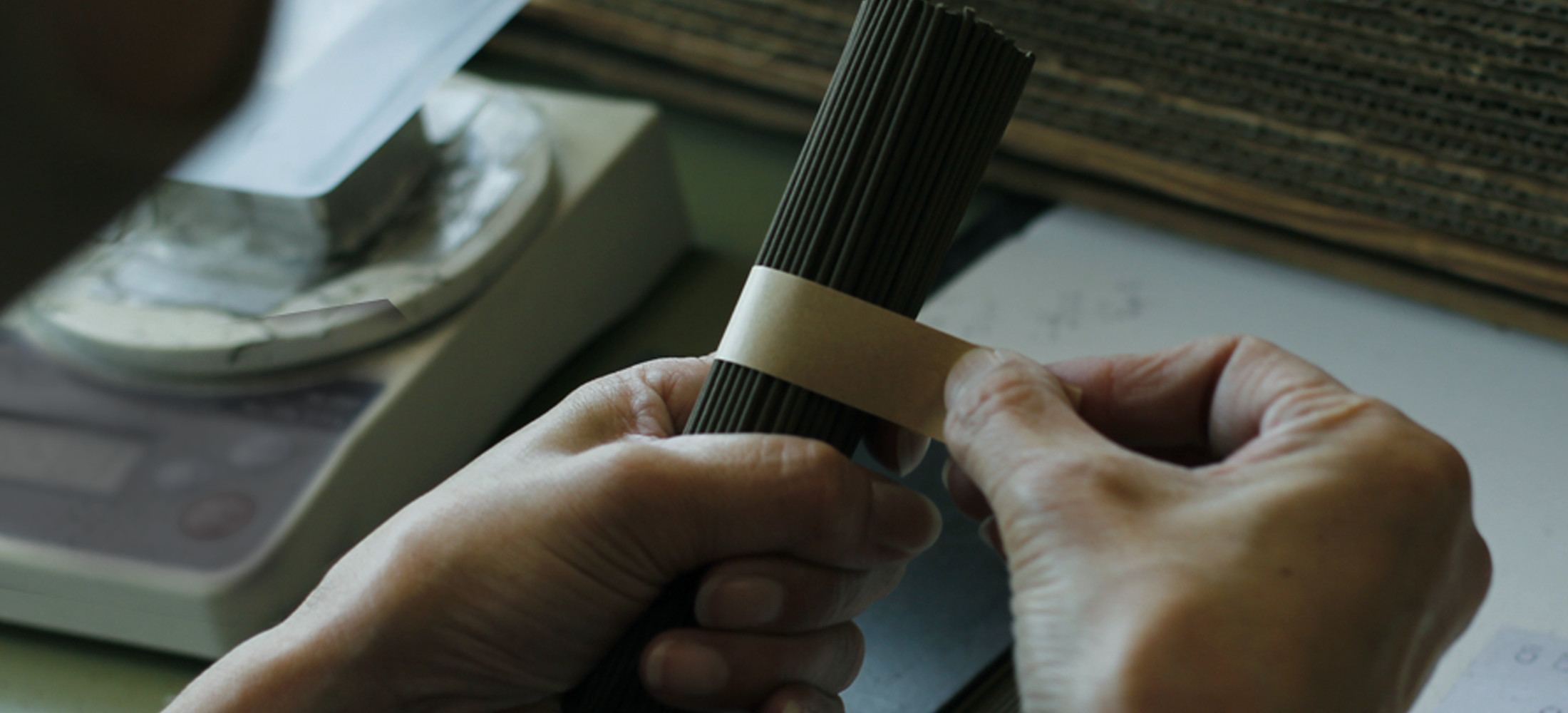 天然の香料は入手した産地や季節、個体などよって香りが異なります。それらを複数種類練り合わせ、繊細に香りを整える調香という技術が職人に刻まれていきました。湿度や気温が少し変わるだけでお線香の質が変わるため、製造過程では今なお職人が手のひらで握りしめて繊細な質感を見極め、お線香の質を整えていきます。